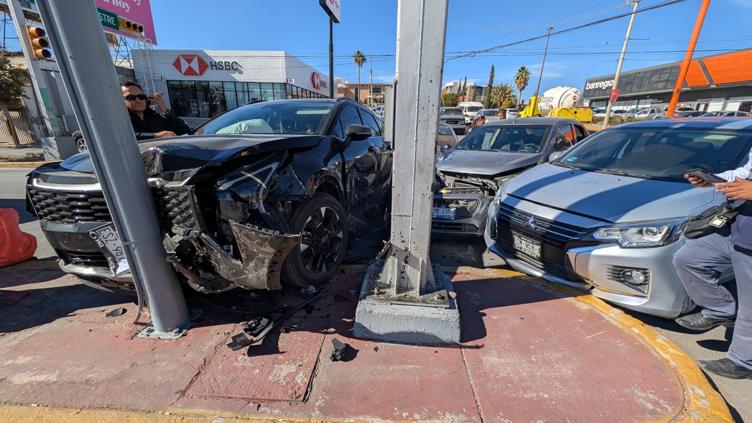 Choque múltiple en Blvd. Antonio Ortiz Mena: un Mitsubishi Mirage y un Chevrolet Beat, al abrir paso a ambulancia y adelantarse, fueron impactados por una KN Sportage que terminó contra cámaras del C4.