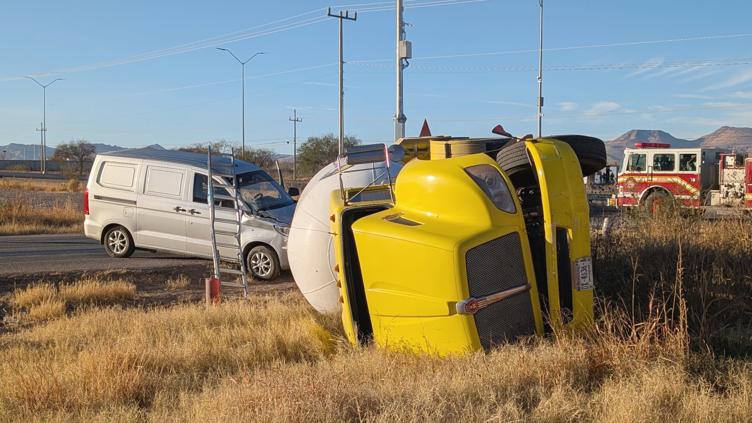 Esta mañana se registró un choque con volcadura entre una pipa de gas cargada al 60% y una camioneta Chevrolet Tornado gris en el entronque al Cereso, sobre Lombardo Toledano. La pipa volcó sobre su costado derecho y no se reportaron lesionados.