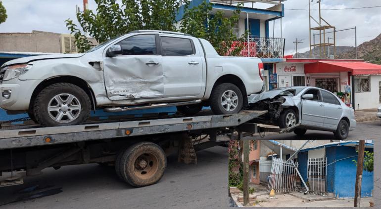 Hoy por la mañana se registró un choque entre una Ford Ranger y un Toyota Corolla en las calles Tamaulipas y Armendáriz, en la colonia La Junta, El cual dejó daños en los automotores y en un domicilio debido a que la pickup salió proyectada contra el barandal del mismo.