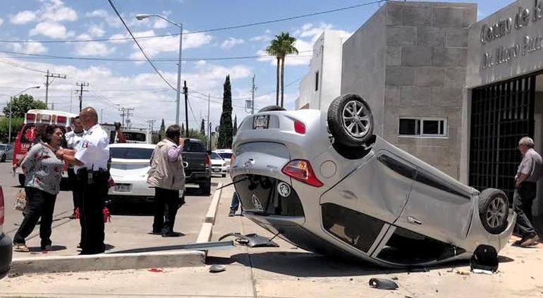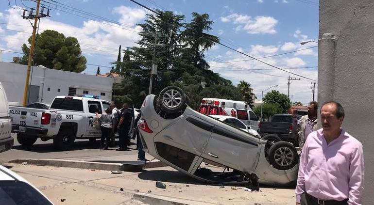 Conductor de Hyundai I10 omitió alto en la calle Ramírez Calderón y chocó sobre la avenida Trasviña y Retes contra Volkswagen y volcó. Terminó una mujer lesionada.