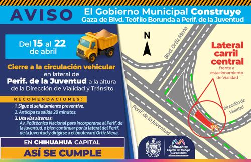 El director de Obras Públicas, Carlos Rivas, informó sobre el cierre temporal a la circulación en la lateral del Periférico de la Juventud, en sentido sur a norte, a la altura de las oficinas de la Dirección de Vialidad y Tránsito, debido a trabajos de modernización de infraestructura hidráulica.