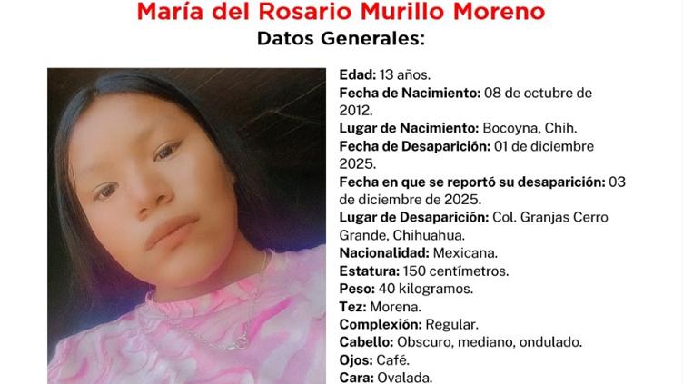 La Fiscalía de 13 años María del Rosario Murillo Moreno desapareció el 1 de diciembre de 2025 en la colonia Granjas Cerro Grande; la Fiscalía activó Alerta Amber y pide ayuda ciudadana para localizarla.