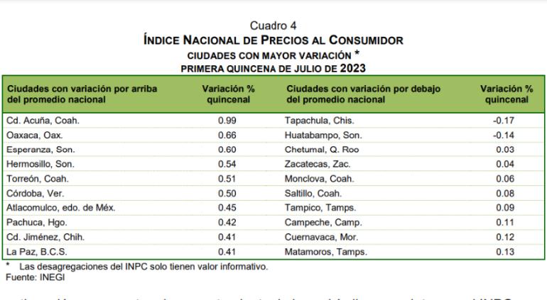 En el cuadro sobre ciudades con mayor variación de inflación durante dicha quincena figura sólo una ciudad del estado de Chihuahua: Ciudad Jiménez.