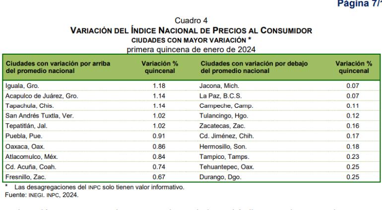 En el otro extremo, la ciudad de Iguala, estado de Guerrero, fue la que tuvo el mayor índice de inflación en la última quincena con 1.18%.