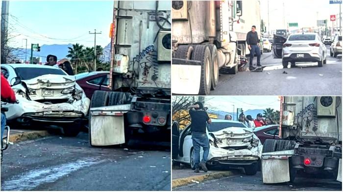 Dos vehículos fueron chocados por un tractocamión que los "prensó" contra otro tráiler en la Tecnológico y casi Miguel de Cervantes, lo que dejó a varias personas lesionadas y cuantiosos daños materiales.