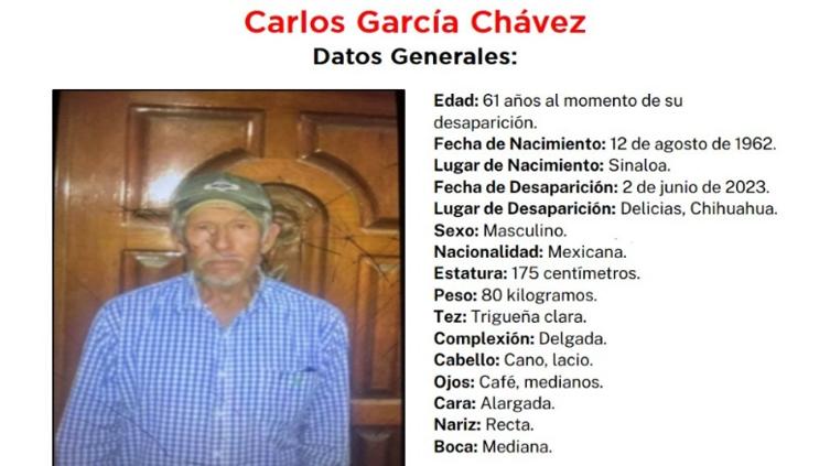 La Fiscalía General del Estado de Chihuahua solicita el apoyo de la ciudadanía para localizar a Carlos García Chávez, de 61 años de edad, quien fue reportado como desaparecido el 2 de junio de 2023 en la ciudad de Delicias, Chihuahua.