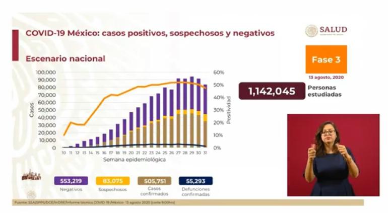 En cuanto a las defunciones México llegó a 55 mil 293, es decir, 627 más que confirmaron en el último reporte (no sucedieron en 1 día).