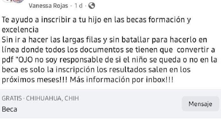 Los ‘coyotes’ anuncian en redes sociales, en particular grupos de Facebook, ofreciendo “ayuda para inscribir a tu hijo en las becas formación y excelencia”.