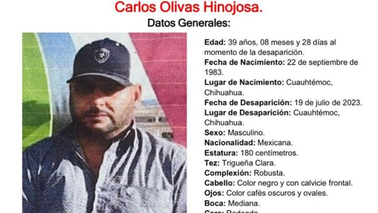 La Fiscalía solicita ayuda para encontrar a Carlos Olivas Hinojosa, quien desapareció a sus 39 años el 19 de julio del 2023 en el municipio de Cuauhtémoc. Por ahora se desconoce su paradero.