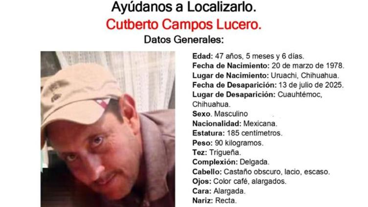 La Fiscalía solicita ayuda para encontrar a Cutberto Campos Lucero de 47 años, quien desapareció el 13 de agosto del presente año en Cuauhtémoc. Por ahora se desconoce su paradero.