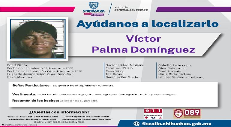 Los familiares y Fiscalía están solicitando ayuda para encontrar a Víctor Palma Domínguez de 20 años, quien desapareció el 4 de diciembre del presente año en Cuauhtémoc, por el momento desconocen su paradero.
