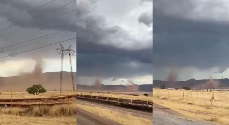 Algunos ciudadanos de Chihuahua que circulaban por la carretera a Cuauhtémoc dieron a conocer videos en los que muestran varios remolinos cercanos a El Charco, hasta el momento desconocen el tamaño del mismo.