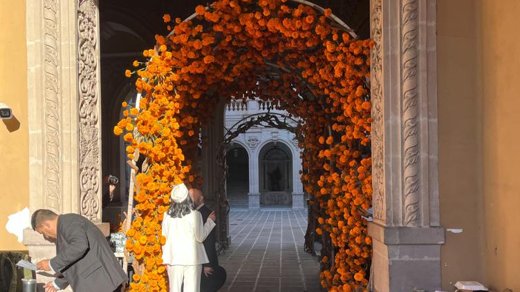 Iniciaron trabajados de decoración en una de las entradas de Palacio de Gobierno, con un pabellón y arco decorado con flores de cempasúchil.