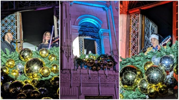 Como parte de una sorpresa para los asistentes el encendido del árbol navideño en Plaza de Armas, se presentaron músicos con villancicos navideños desde el balcón en el edificio de Presidencia Municipal.
