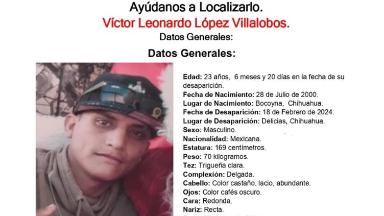 La Fiscalía solicita ayuda para encontrar a Víctor Leonardo López Villalobos, quien desapareció a sus 23 años el 18 de febrero del 2024 en Delicias. Por ahora se desconoce su paradero.