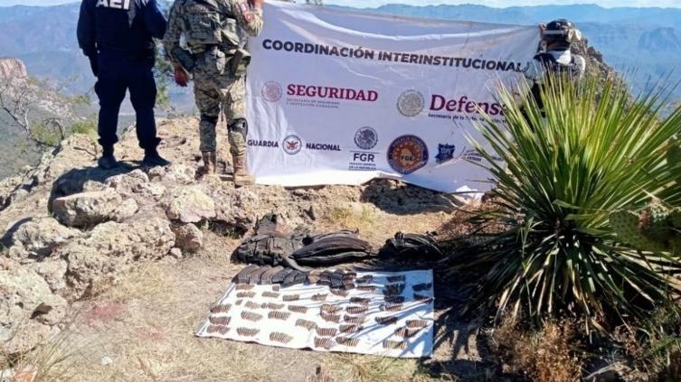 Elementos de la Fiscalía, Ejército Mexicano y Guardia Nacional aseguraron un campamento clandestino y lograron el aseguramiento de un arsenal en el municipio de Moris.