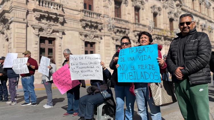 Trabajadores administrativos jubilados de la Universidad Autónoma de Chihuahua, llevan cinco horas en el cierre del Centro de la ciudad, como parte de su protesta para exigir el pago de aguinaldos del fideicomiso.