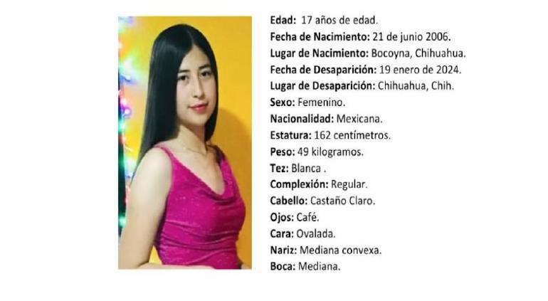 La Fiscalía General del Estado solicitó ayuda a la comunidad para localizar a Evelyn Araiza González de 17 años de edad, originaria de Bocoyna pero desapareció en ciudad Chihuahua.