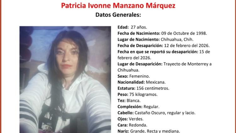 Autoridades de Chihuahua buscan a Patricia Ivonne Manzano Márquez, mujer de 27 años desaparecida el 12 de febrero de 2026 cuando viajaba de Monterrey a Chihuahua; se solicita apoyo ciudadano para localizarla.