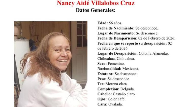Nancy Aidé Villalobos Cruz, de 56 años, fue reportada como desaparecida el 02 de febrero de 2026 en la colonia Alamedas, en la ciudad de Chihuahua. La mujer padece Alzheimer y fue vista por última vez vistiendo pantalonera gris y suéter verde militar.
