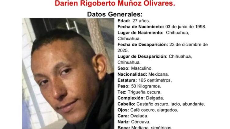 La Fiscalía de Chihuahua busca a Darien Rigoberto Muñoz Olivares, de 27 años, desaparecido desde el 23 de diciembre de 2025 en la colonia Girasoles VI etapa.