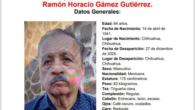 El ciudadano Ramón Horacio Gámez Gutiérrez, de 84 años, desapareció en la capital de Chihuahua luego de salir de su domicilio el pasado sábado 27 de diciembre.