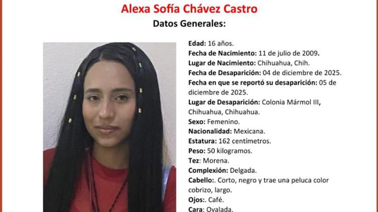 La joven Alexa Sofía Chávez Castro, de 16 años de edad, desapareció el 4 de diciembre. En la colonia Mármol III la vieron por última vez y hasta el momento se desconoce su paradero.
