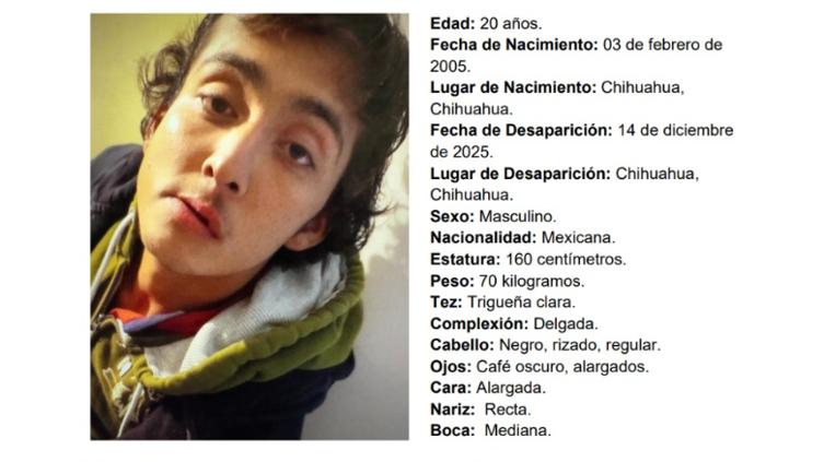 La Fiscalía General del Estado de Chihuahua emitió una ficha de búsqueda para localizar a Eduardo Alberto Vázquez Ochoa, joven de 20 años de edad, quien fue reportado como desaparecido desde el pasado 14 de diciembre de 2025, en la ciudad de Chihuahua.