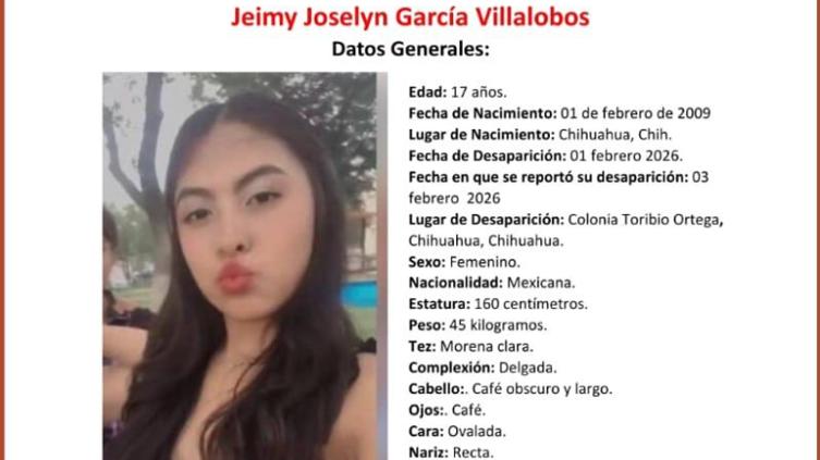 La Fiscalía General del Estado solicitó el apoyo de la ciudadanía para localizar a Jeimy Joselyn García Villalobos, de 17 años de edad, quien fue reportada como desaparecida en la ciudad de Chihuahua.