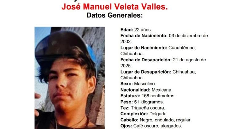 La Fiscalía General del Estado emitió una alerta de búsqueda para José Manuel Veleta Valles, joven de 22 años que fue reportado como desaparecido desde el pasado 21 de agosto en la ciudad de Chihuahua.