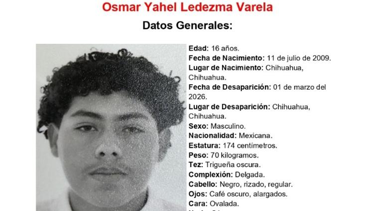 La Fiscalía General del Estado de Chihuahua solicitó el apoyo de la ciudadanía para localizar a Osmar Yahel Ledezma Varela, de 16 años de edad, quien fue reportado como desaparecido el pasado 1 de marzo de 2026 en la ciudad de Chihuahua.