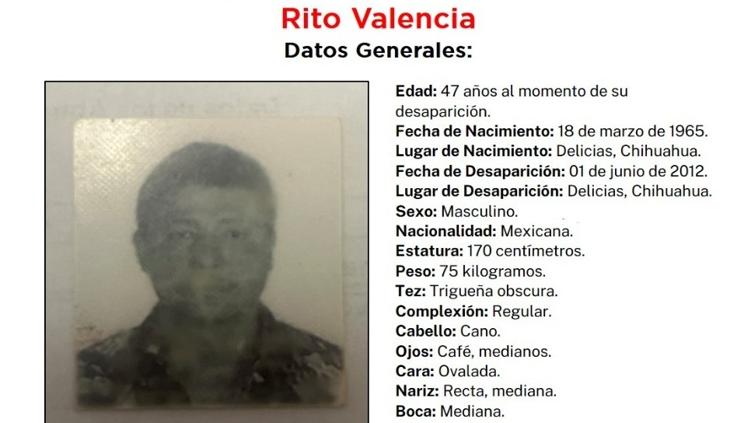 La Fiscalía General del Estado de Chihuahua lanzó un llamado a la ciudadanía para ayudar a localizar a Rito Valencia, desaparecido desde el 1 de junio de 2012 en la ciudad de Delicias.
