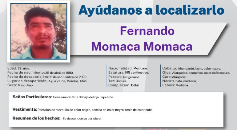 Fernando Momaca Momaca, un hombre de 32 años de edad, desapareció el pasado 06 de septiembre de 2022, en Agua Zarca, municipio de Morelos, Chihuahua.
