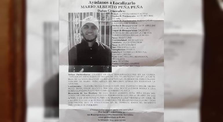La madre de Peña mencionó que la ultima vez que lo vio salía de su domicilio en la colonia Toribio Ortega rumbo a su trabajo el jueves 22 de abril al rededor de las 5:00 de la tarde mientras que el día viernes 23 se se comunico con ella y le aviso que seguía en el trabajo desde entones desconoce su paradero.