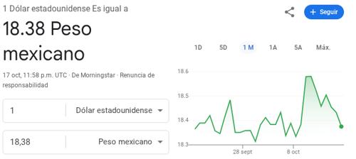 Banco de México (Banxico) cerró operaciones de la semana el viernes 17 de octubre por la tarde con el dólar spot, referencia entre bancos, en 18.3899 pesos.