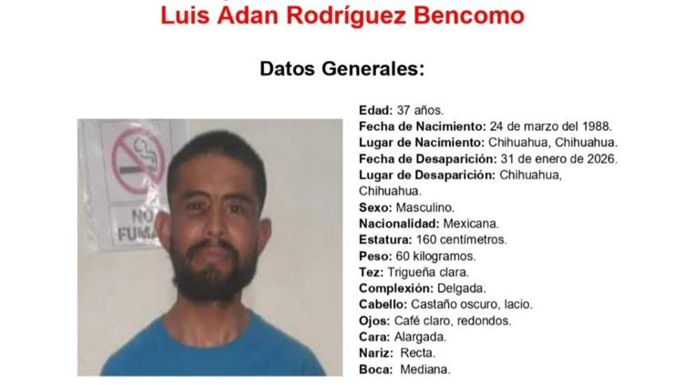 La Fiscalía General del Estado de Chihuahua solicita el apoyo de la ciudadanía para localizar a Luis Adán Rodríguez Bencomo, de 37 años de edad, quien fue visto por última vez el pasado 31 de enero de 2026 en la colonia Roberto Fierro, en esta ciudad