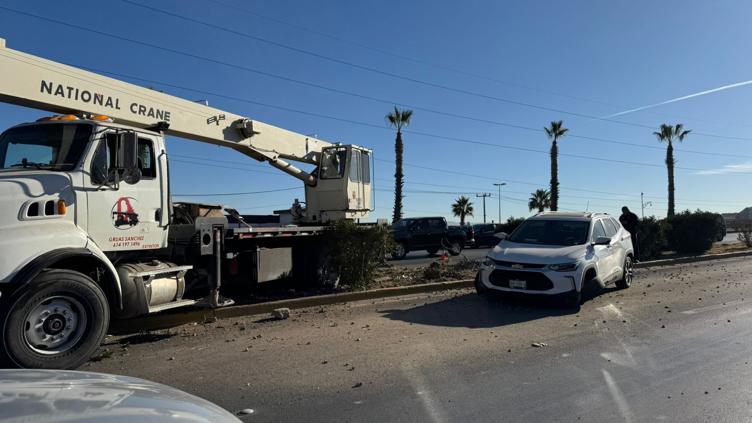 Grúa choca poste y termina en camellón tras accidente en Fashion Mall