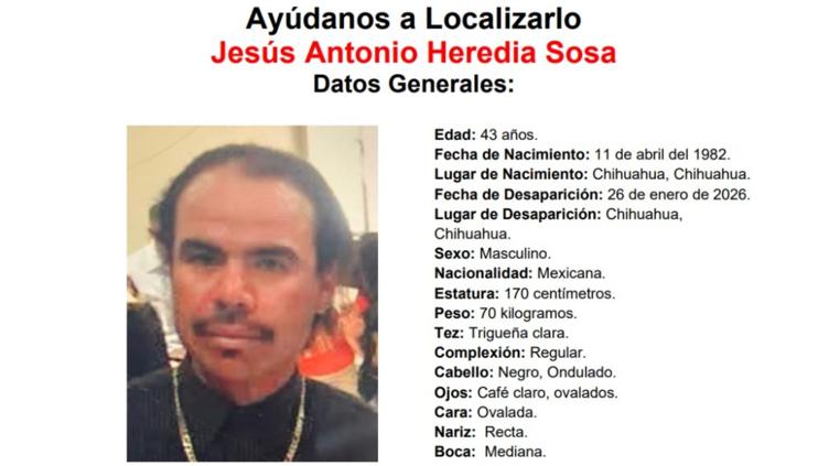 La Fiscalía General del Estado, en coordinación con el Gobierno del Estado de Chihuahua, emitió una ficha de búsqueda para solicitar el apoyo de la ciudadanía en la localización de Jesús Antonio Heredia Sosa, quien fue reportado como desaparecido en la ciudad de Chihuahua.