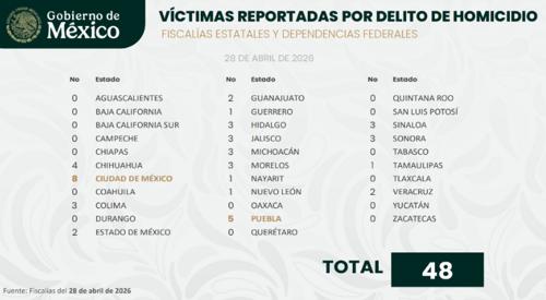 En el informe, dos entidades federativas fueron destacadas especialmente por la SSPC: Ciudad de México y Puebla, con nueve víctimas en la capital mexicana y cinco en el estado poblano.