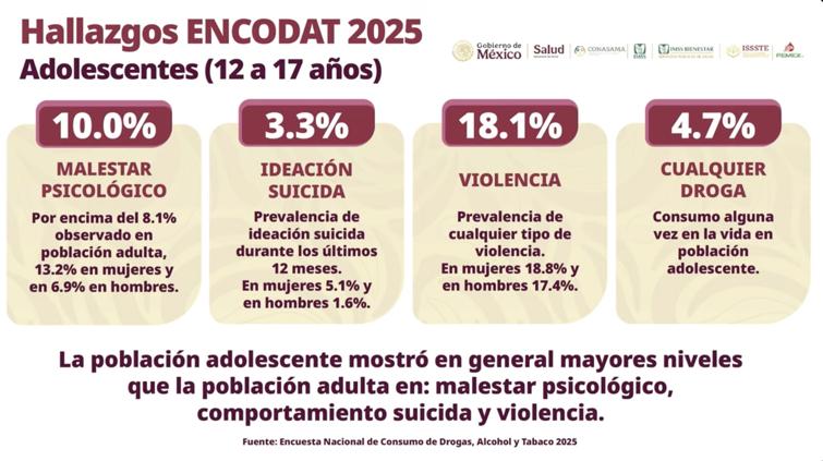 Durante La Mañanera del Pueblo, el funcionario explicó que el 10% de los jóvenes entre 12 y 17 años reporta algún tipo de malestar psicológico, una cifra superior al 8.1% registrado en la población adulta, lo que evidencia una mayor vulnerabilidad en este grupo.