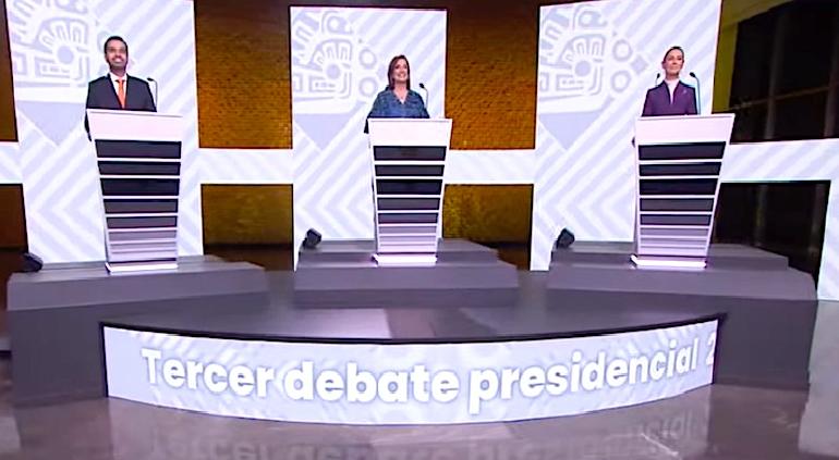 Esta noche se celebra el último debate presidencial de México, un evento clave en el proceso electoral de 2024. Participarán las candidatas Claudia Sheinbaum, de la coalición Juntos Hacemos Historia; Xóchitl Gálvez, representante del Frente Amplio por México; y el candidato Jorge Álvarez Máynez, del partido Movimiento Ciudadano.