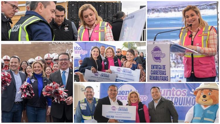 Las acciones incluyeron la rehabilitación de tramos carreteros, la entrega de mobiliario y equipo para escuelas de educación básica, así como la inauguración de la avenida Carlos Blake, una de las principales vialidades de la ciudad de Delicias.