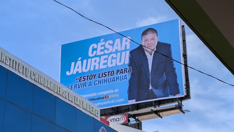 Un espectacular con la imagen del fiscal general César Jáuregui y el lema 'Estoy listo para servir a Chihuahua' apareció hoy en Prolongación Teófilo Borunda y Miguel Ángel Olea.