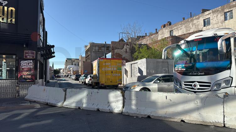 Por el cierre de calles y la protección con vallas metálicas en edificios del Centro por el 8M, vehículos estacionados sobre la calle Séptima y Aldama, dificultaron el paso de rutas del transporte público.