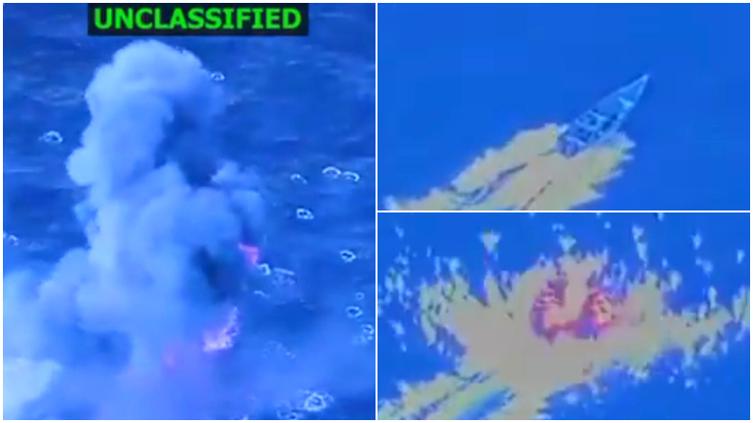 En el video puede verse el bote que navega a alta velocidad, cuando de pronto cae un proyectil y explota en llamas, sacudiendo las aguas y cubriendo la escena en una cortina de humo al instante.