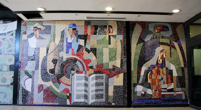 Indican que se trata de una obra considerada como patrimonio cultural del IMSS, elaborada en el año de 1958, en la técnica de mosaico veneciano y forma parte de tres paneles de estilo geometrista, que están instalados en el acceso al vestíbulo.