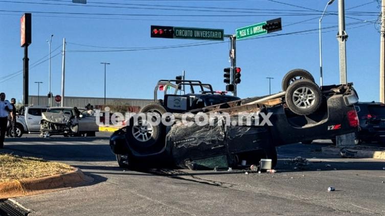 Un aparatoso accidente vial se registró en el cruce de las calles Paseos de la Universidad y Circuito Universitario, luego de que el conductor de una Silverado se pasara el semáforo en rojo y provocara un fuerte choque-volcadura, que dejó como saldo tres personas lesionadas.