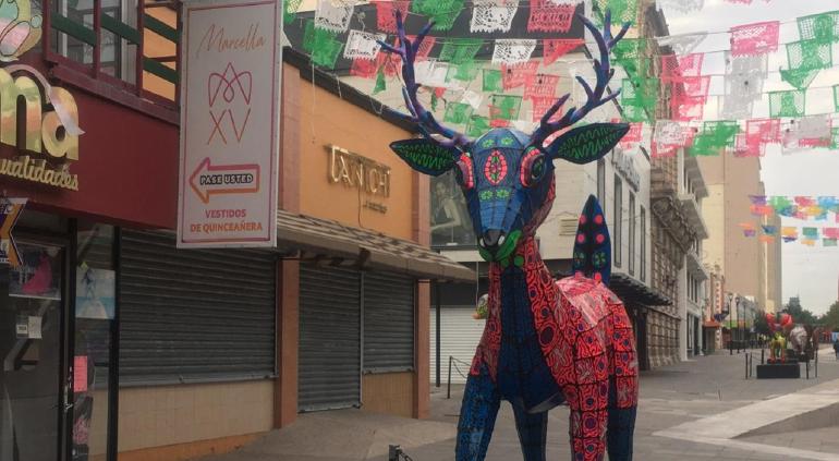 En el marco del 311° aniversario de la fundación de la ciudad capital de Chihuahua, amaneció una instalación de arte de alebrijes en la calle Victoria del Centro Histórico.