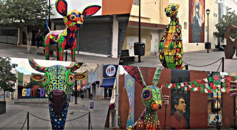 Autoridades municipales instalaron esculturas de alebrijes en la calle Victoria del Centro Histórico de la ciudad de Chihuahua como parte del Festival Internacional de la ciudad de Chihuahua (FICUU) 2020 celebrando el 311° aniversario de la fundación de Chihuahua