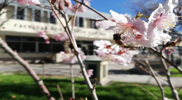 “El cerezo japonés florece en los jardines de nuestra Facultad, una belleza que queremos compartir con todos ustedes. ¡Ánimo y a seguirse cuidando! “